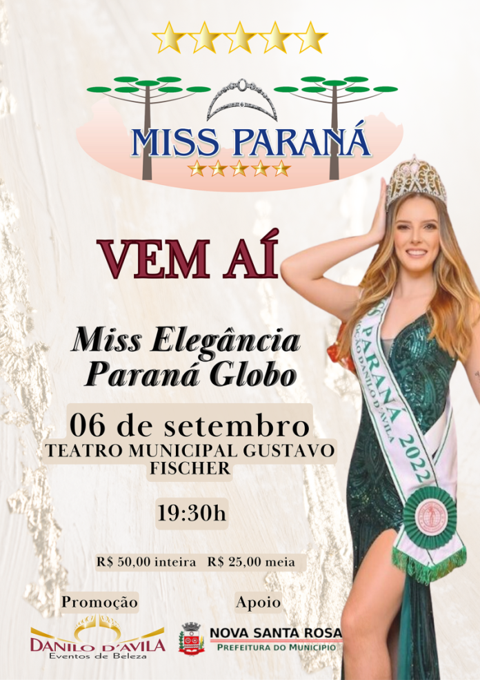 A Prefeitura de Nova Santa Rosa informa que a abertura oficial do concurso Miss Paraná Globo 2023 acontece em Nova Santa Rosa na quarta-feira, dia 6 de setembro, onde será escolhida a Miss Elegância Globo 2023. O evento que promete muito glamour e elegância acontece no Teatro Municipal Gustavo Fischer a partir das 19h30.