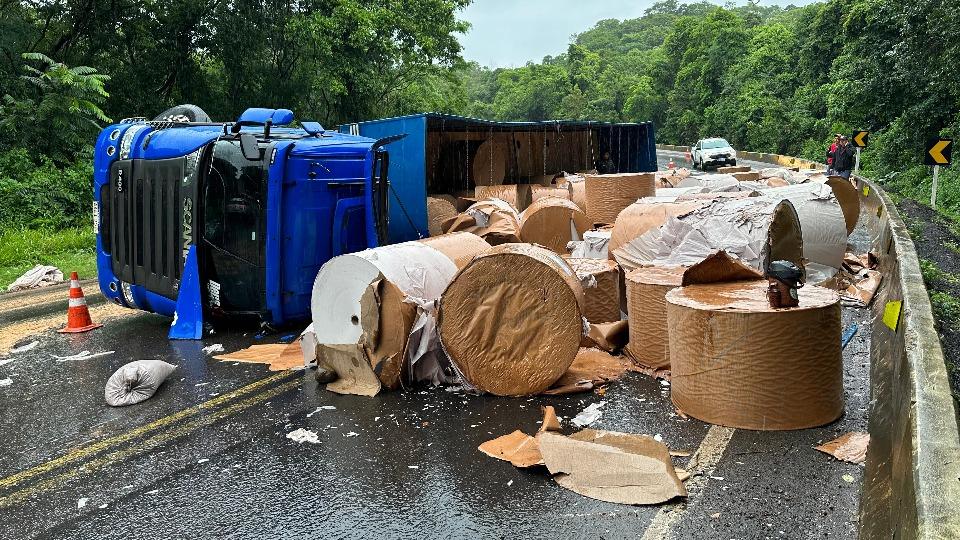 Carreta carregada com bobinas de papel industrial tombou no fim da manhã desta sexta-feira (27), no quilômetro 485 da BR 277 em Nova Laranjeiras.