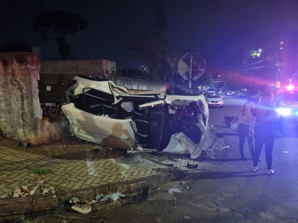 O motorista do Kwid, um homem de 31 anos, seguia pela rua 13 de maio quando foi atingido por um Corsa, que trafegava na Rua Pará. Com a força do impacto, o Kwid capotou e chegou a derrubar parte do muro de um imóvel.