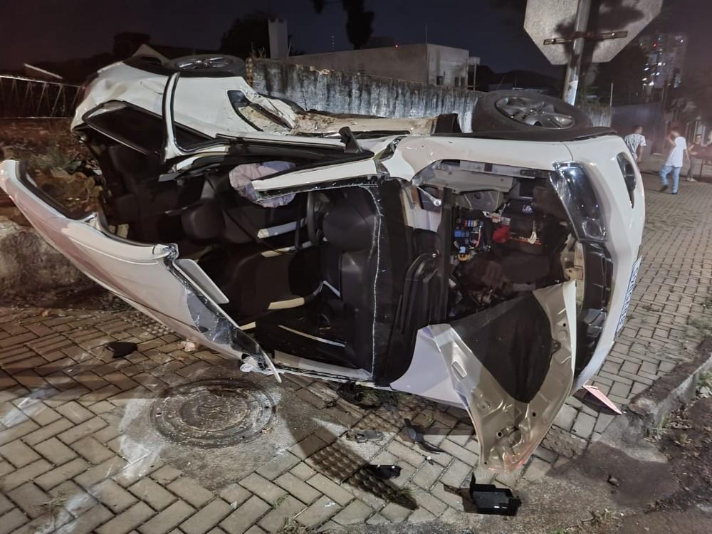 Um Renault Kwid ficou completamente destruído no início da noite desta terça-feira (03) ao se envolver em um acidente no cruzamento das ruas 13 de maio com Pará, no bairro Country em Cascavel.