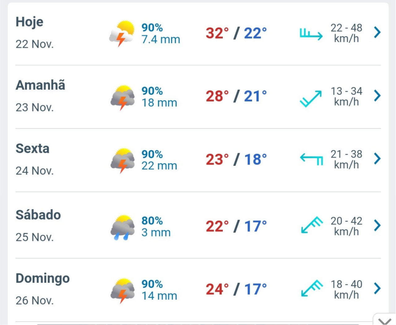 Como informou o SIMEPAR, exista uma grande possibilidade de chuva para fim da tarde e início da noite desta quarta-feira (22). O INMET já havia publicado um alerta iniciando as 15h01, de tempestade para os estados do Rio Grande do Sul, Santa Catarina e Paraná. Chuva entre 30 e 60 mm/h ou 50 e 100 mm/dia, ventos intensos (60-100 km/h), e queda de granizo. Risco de corte de energia elétrica, estragos em plantações, queda de árvores e de alagamentos.