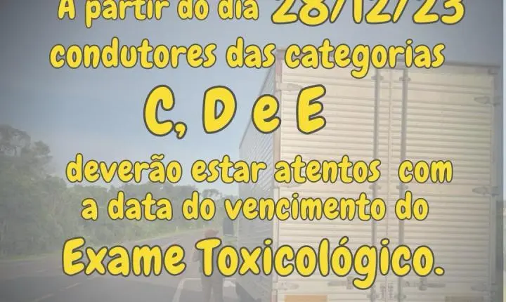 O exame toxicológico deve ser realizado a cada 30 meses (2 anos e 6 meses) para condutores das categorias C, D e E, com o objetivo de identificar o consumo de substâncias que prejudiquem a condução de veículos. A partir do dia 28 de dezembro de 2023, o condutor que estiver com o exame toxicológico vencido, poderá ser notificado com uma multa gravíssima no valor de R$ 1.467,00 e no caso de reincidência dentro de 12 meses, o valor duplica e o condutor ainda poderá ter o direiro de dirigir suspenso por até 3 meses. Vale lembrar que caso não seja abordado em alguma fiscalização, quando for realizar a renovação da CNH será notificado automaticamente pelo Detran.