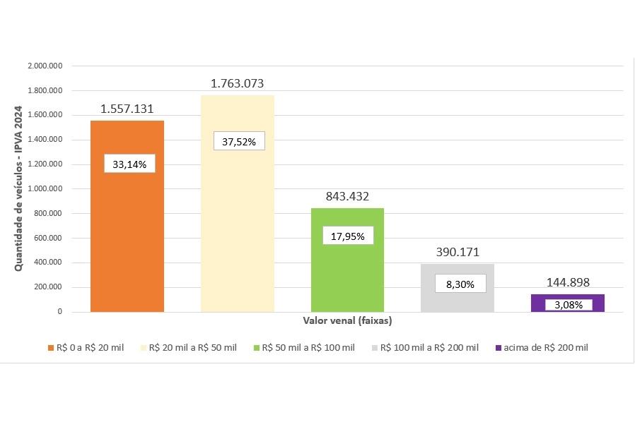 A frota que custa menos de R$ 20 mil abrange 33,1% do total tributado, ou 1.557.131 veículos. Mais da metade dos veículos deste segmento do mercado é composta por motocicletas e motonetas (também conhecidas como “scooters”). A faixa de valor entre R$ 50 mil e R$ 100 mil representa 17,9% da frota (843.432 veículos). Já os veículos com valores entre R$ 100 mil e R$ 200 mil representam 8,3% (390.171), enquanto aqueles cuja avaliação ultrapassa R$ 200 mil correspondem a 3,1% (144.898) do total.