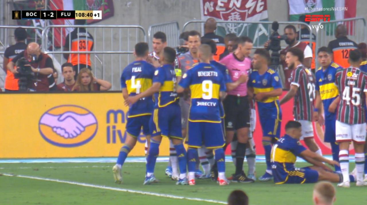 Na tarde deste sábado (04), o Boca Juniors vai enfrentando o Fluminense em pleno Maracanã pela grande final da Copa Conmebol Libertadores. Durante a prorrogação, nos acréscimos do primeiro tempo, uma confusão tomou conta do gramado após um possível pênalti para os xeneizes.