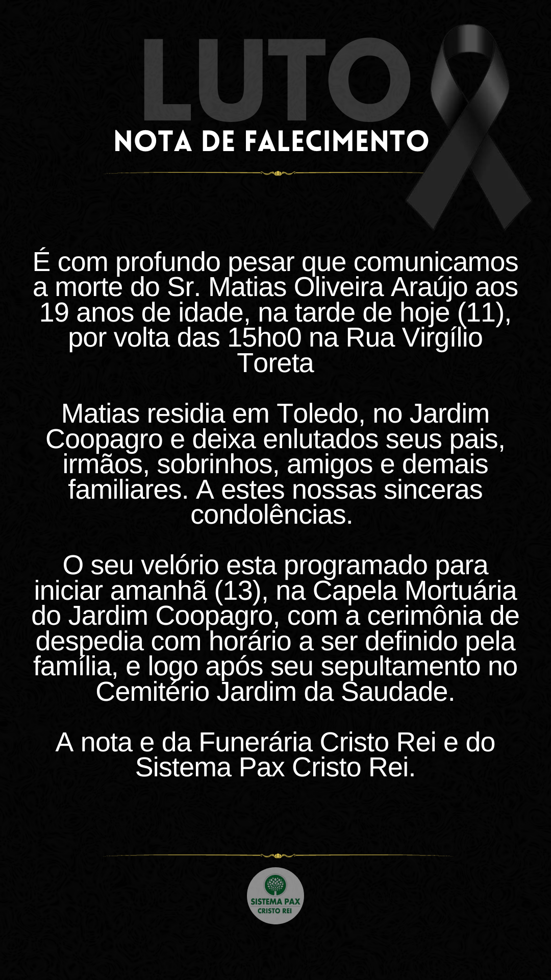 A pedido da família, o sistema Pax Cristo Rei, emitiu uma nota de pesar, sobre ocorrido e informando aos amigos e familiares do jovem o horário de seu funeral.