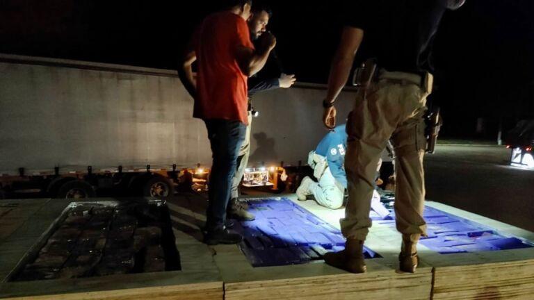 Nas imagens, é possível ver os policiais retirando os ilícitos que estavam escondidos dentro do veículo de carga. A Polícia Rodoviária Federal (PRF) fazia o patrulhamento na região e apreendeu a carga. Segundo a Polícia Civil, o motorista não foi localizado até o momento.