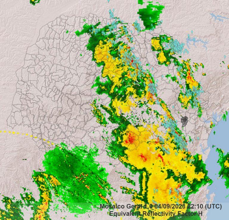 Neste momento, a chuva ocorre entre as regiões norte, Campos Gerais, centro-sul e o leste do estado.