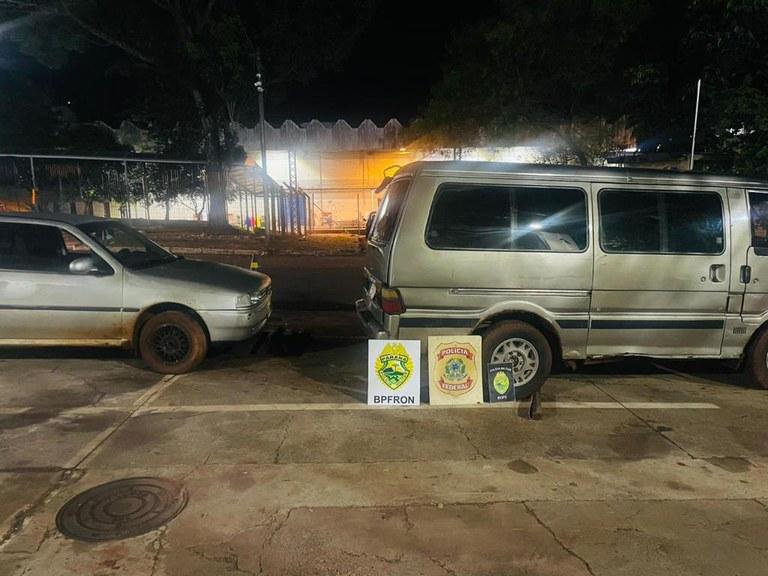 Com a suspeita de transporte de produtos ilícitos, os policiais se deslocaram até o local, encontrando abandonados dois veículos, sendo uma van e um carro de passeio, ambos com parte da carga de cigarros contrabandeados que seriam trazidos para o país.