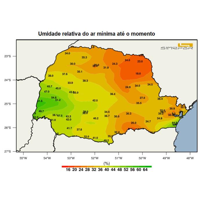 Segundo o relatório do SIMEPAR, o calor era para se manter em todo o Paraná. Destaque também foi feito para os baixos índices de umidade relativa do ar.
